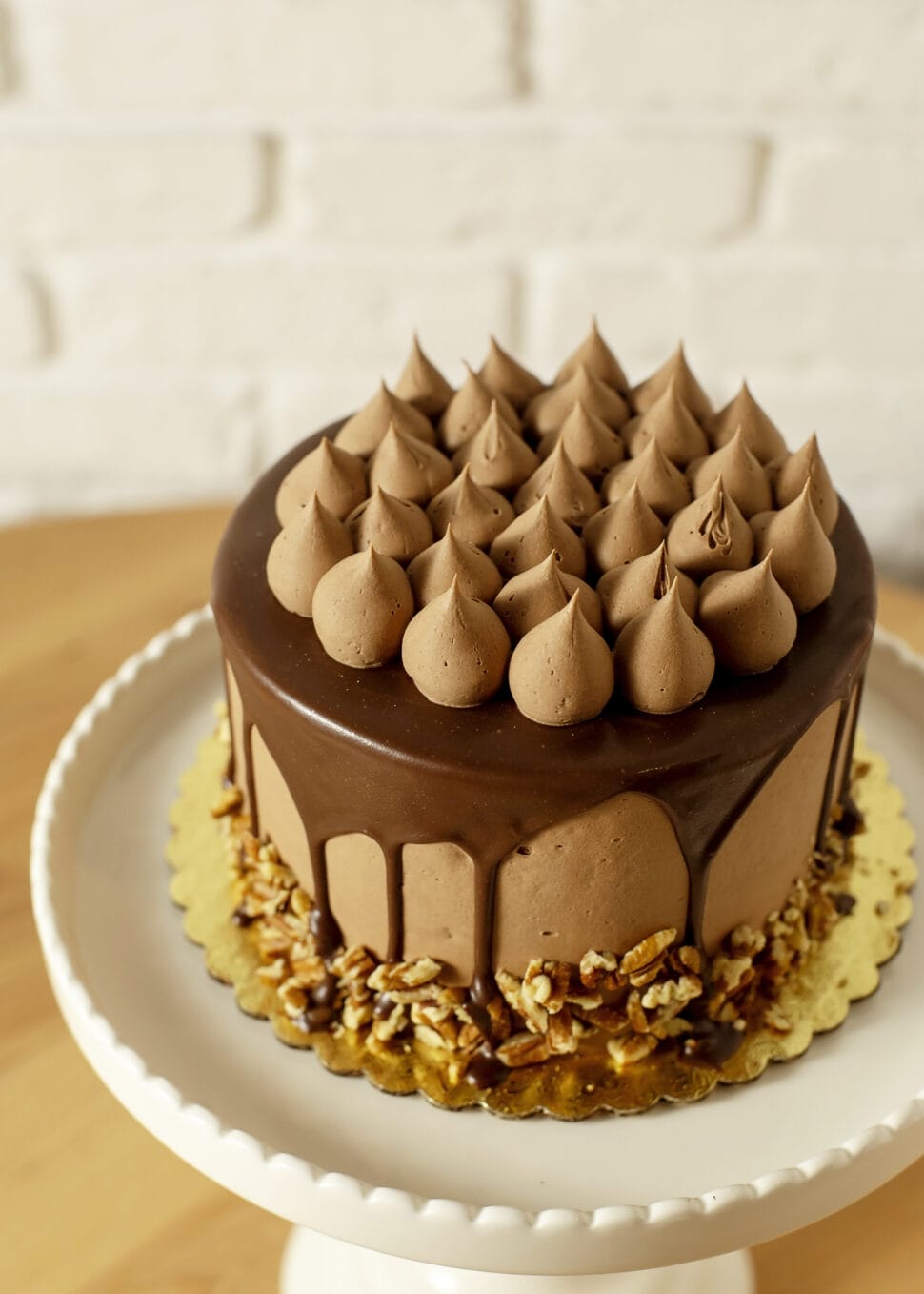 Chocolate cake filled with caramel, iced in chocolate buttercream, topped with chocolate ganache and candied pecan.