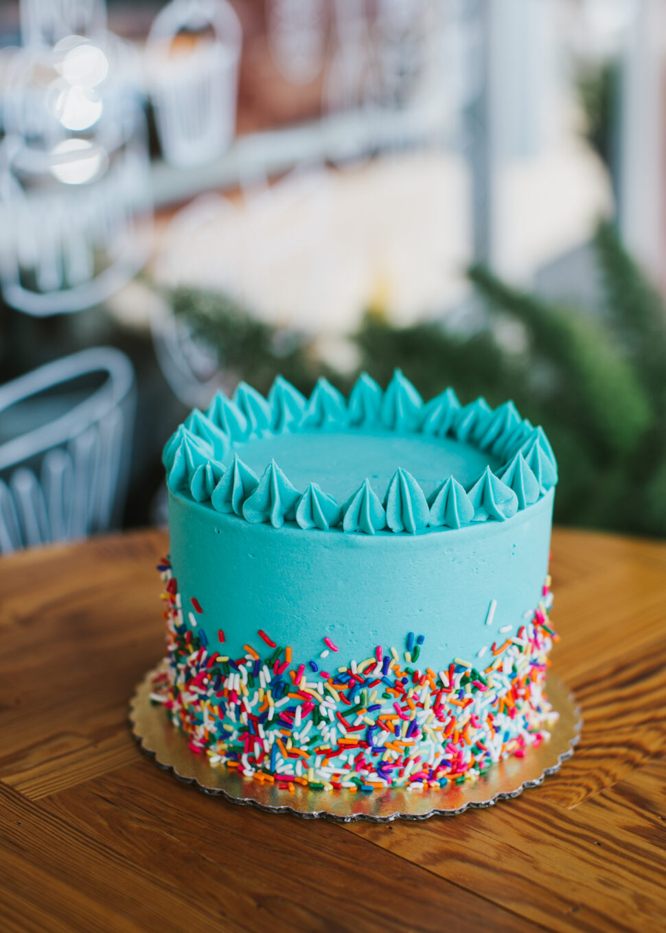 Vanilla cake with rainbow sprinkles baked in, filled and iced in vanilla buttercream.