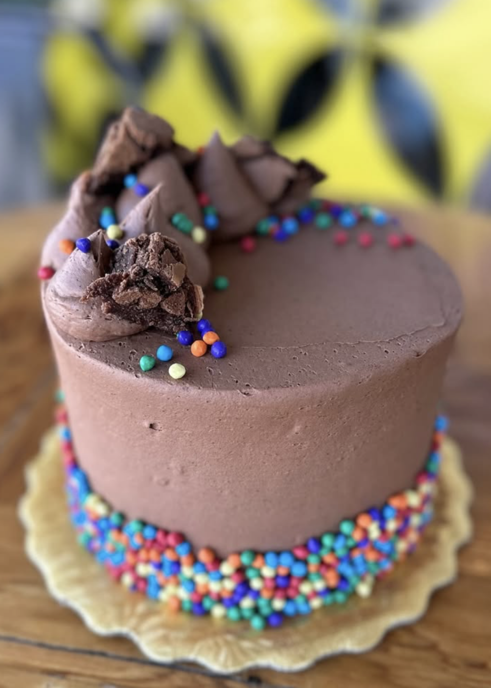 Our dark chocolate cake filled with chocolate ganache and iced in chocolate buttercream, topped with brownies pieces and chocolate meteors.