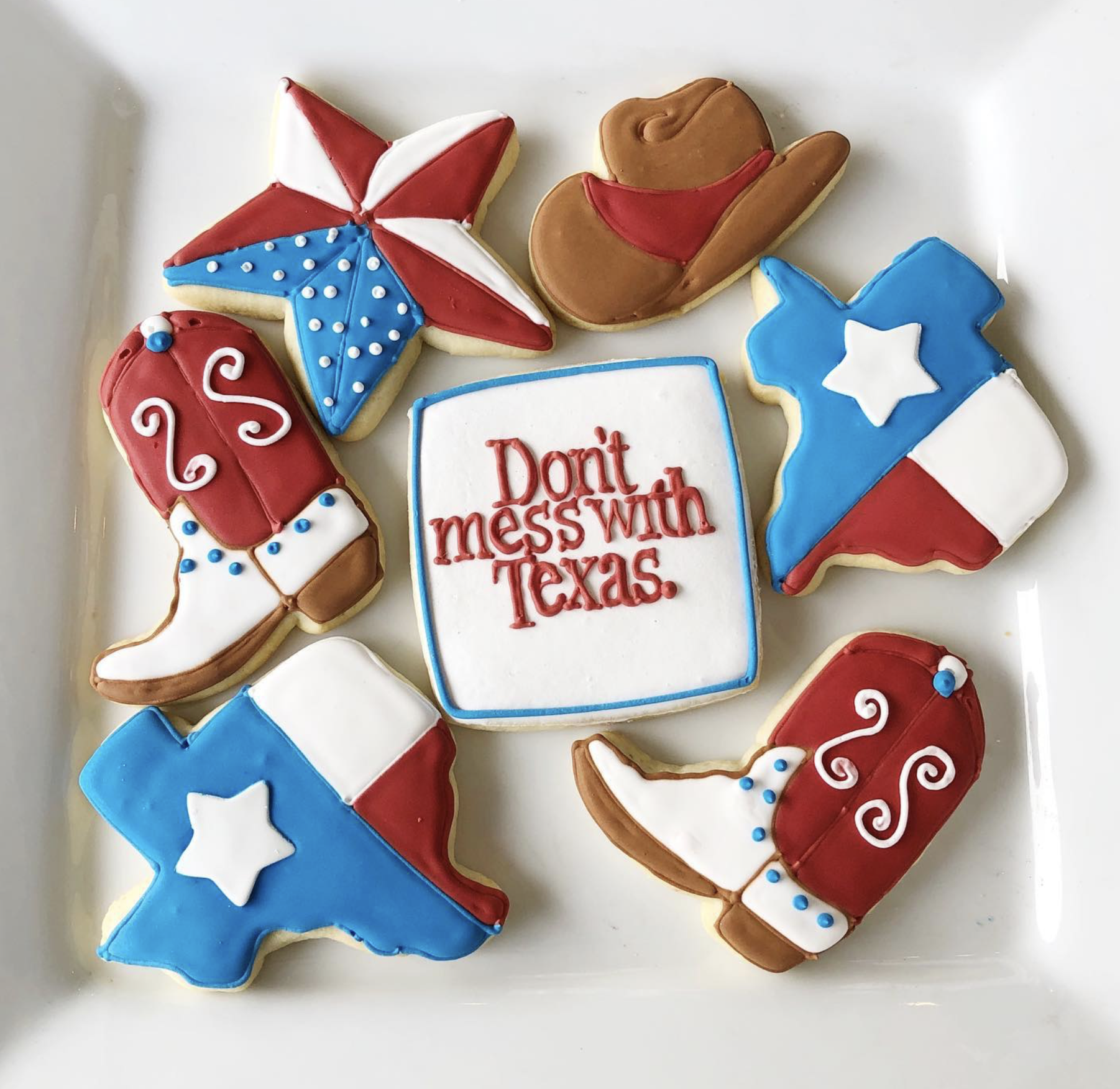 $0.00 Each Don’t Mess with Texas Set comes with 3 hats cookies, 3 boots cookies, 3 Texas cookies, and 3 squares cookies with “Don’t mess with Texas” cookies. "*" indicates required fields Don't Mess with Texas SetCustom OrderQuantity*1 Dozen Cookies2 Dozen Cookies3 Dozen CookiesAdd individual packaging?*No packaging12 Cellophane bag with matching ribbon24 Cellophane bag with matching ribbon36 Cellophane bag with matching ribbon48 Cellophane bag with matching ribbonPick-up Date* MM slash DD slash YYYY Pick-up Time*7:00am7:30am8:00am8:30am9:00am9:30am10:00am10:30am11:00am11:30am12:00pm12:30pm1:00pm1:30pm2:00pm2:30pm3:00pm3:30pm4:00pm4:30pm5:00pm5:30pm6:00pm6:30pm7:00pm7:30pm8:00pmTotal Add to cart Categories: Cookies, Custom Order Related products Funfetti Cake $0.00 Select options Banana Cream Pie Cake $0.00 Select options Peanut Butter Chocolate Cake $0.00 Select options Carrot Cake $0.00 Select options