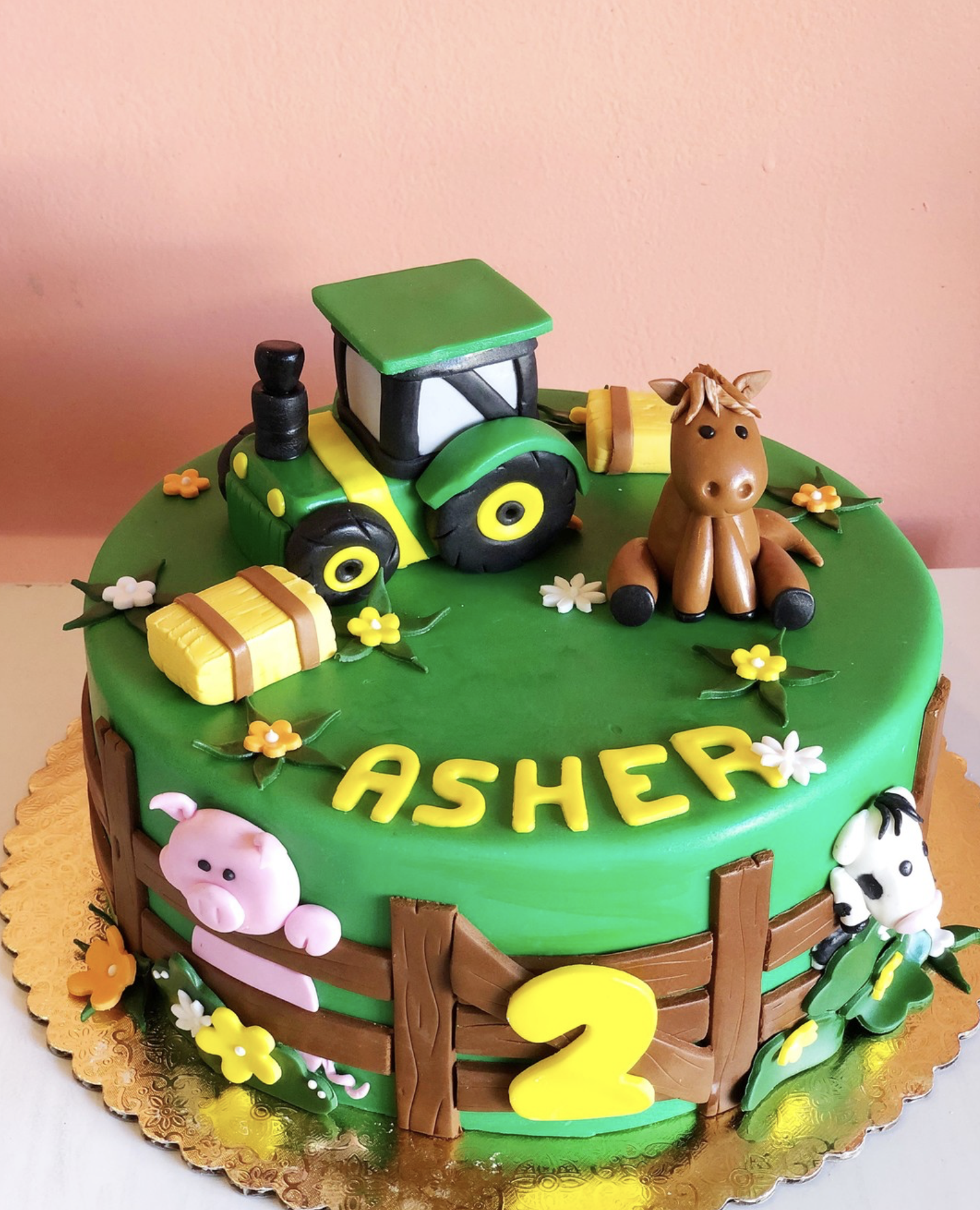 $0.00 Our Farm Cake is covered in green fondant and decorated like a farm! Every cake includes a fondant 3d tractor, horse, and hay bales on top and a fondant fence on the side with a pig and cow peeking out. "*" indicates required fields Farm CakeCustom OrderSize*8 inch Round (Serves 16)10 inch Round (Serves 26)6 inch/ 8 inch (Serves 28)8 inch/10 inch (Serves 42)Gluten Free?*NoYesGluten Free Calc Price: $0.00 Cake and Filling Flavor*Carrot Cake/Cream Cheese IcingChocolate Cake/Oreo ButtercreamGerman Chocolate/Coconut Pecan CustardRed Velvet Cake/Cream Cheese IcingBlackberry Cake/Almond ButtercreamChocolate Cake/Chocolate ButtercreamChocolate Cake/Peanut Butter ButtercreamChocolate Cake/Raspberry JamChocolate Cake/Salted CaramelFunfetti/Vanilla ButtercreamItalian Cream Cake/Cream Cheese IcingLemon Cake/Lemon CurdLemon Cake/Raspberry JamStrawberry Cake/Lemon CurdStrawberry Cake/Strawberry ButtercreamVanilla Cake/Italian Meringue ButtercreamVanilla Cake/Strawberry JamVanilla/Vanilla ButtercreamDecorative Add-Ons (Optional)Custom Fondant Name and Number* Pick-up Date* MM slash DD slash YYYY Pick-up Time*7:00am7:30am8:00am8:30am9:00am9:30am10:00am10:30am11:00am11:30am12:00pm12:30pm1:00pm1:30pm2:00pm2:30pm3:00pm3:30pm4:00pm4:30pm5:00pm5:30pm6:00pm6:30pm7:00pm7:30pm8:00pmTotal Add to cart Categories: Custom Order, Designer Cakes Related products Chocolate Raspberry Cake $0.00 Select options Classic Buttercream Cake $0.00 Select options Berry Chantilly Cake $0.00 Select options Italian Cream Cake $0.00 Select options