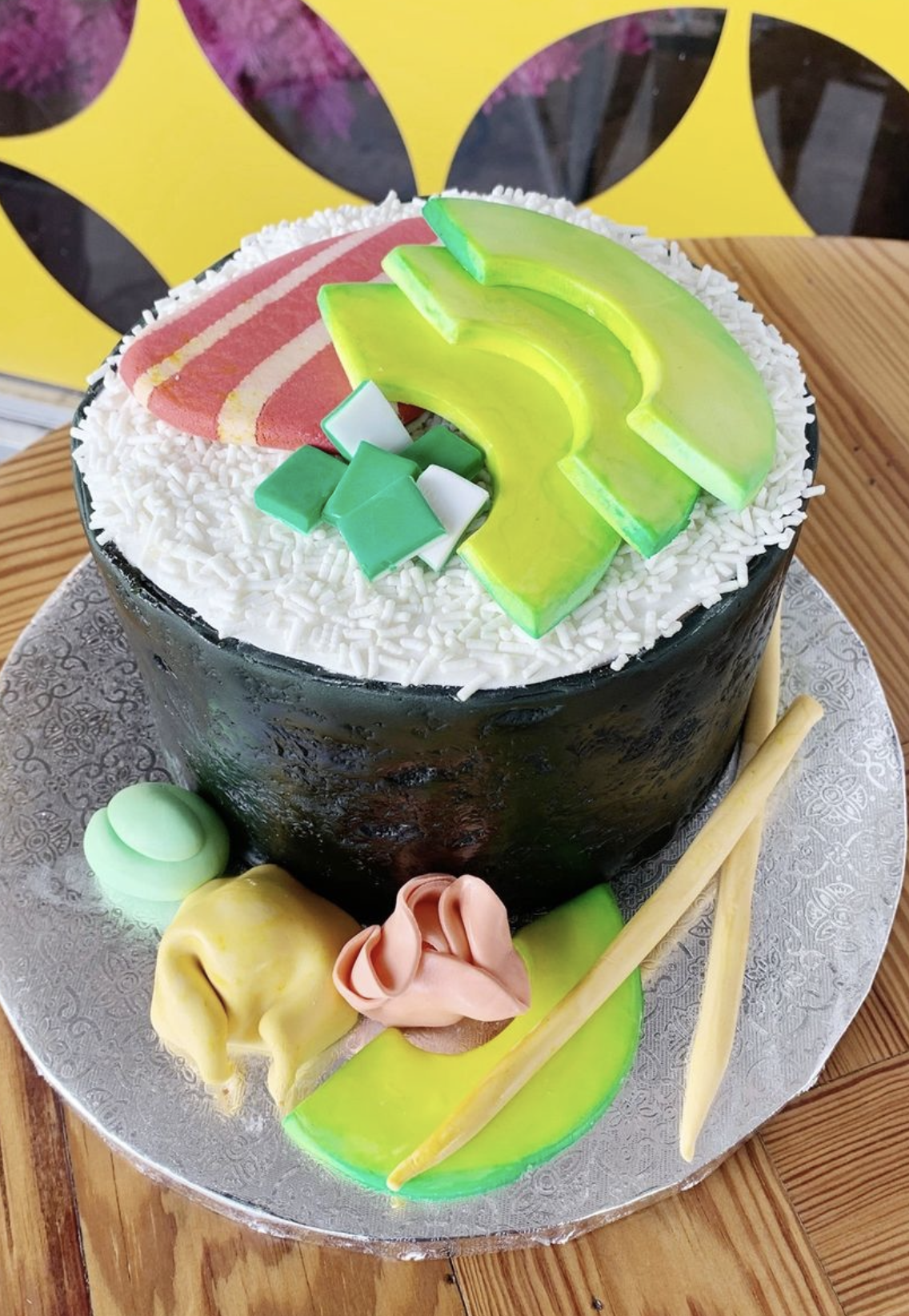 $0.00 Our Sushi Cake comes with 3 layers of cake and 2 layers of filling, decorated with buttercream and fondant to look like a sushi roll! "*" indicates required fields Sushi CakeCustom OrderSize*6 inch Round (Serves 8-12)8 inch Round (Serves 16)10 inch Round (Serves 26)Gluten Free?*NoYesGluten Free Calc Price: $0.00 Cake and Filling Flavor*Carrot Cake/Cream Cheese IcingChocolate Cake/Oreo ButtercreamGerman Chocolate/Coconut Pecan CustardRed Velvet Cake/Cream Cheese IcingBlackberry Cake/Almond ButtercreamChocolate Cake/Chocolate ButtercreamChocolate Cake/Peanut Butter ButtercreamChocolate Cake/Raspberry JamChocolate Cake/Salted CaramelFunfetti/Vanilla ButtercreamItalian Cream Cake/Cream Cheese IcingLemon Cake/Lemon CurdLemon Cake/Raspberry JamStrawberry Cake/Lemon CurdStrawberry Cake/Strawberry ButtercreamVanilla Cake/Italian Meringue ButtercreamVanilla Cake/Strawberry JamVanilla/Vanilla ButtercreamDecorative Add-Ons (Optional)Message Banner Type* Happy Birthday Happy Anniversary Custom Message Banner Custom Buttercream Message No Banner Custom Message*Pick-up Date* MM slash DD slash YYYY Pick-up Time*7:00am7:30am8:00am8:30am9:00am9:30am10:00am10:30am11:00am11:30am12:00pm12:30pm1:00pm1:30pm2:00pm2:30pm3:00pm3:30pm4:00pm4:30pm5:00pm5:30pm6:00pm6:30pm7:00pm7:30pm8:00pmTotal Add to cart Categories: Custom Order, Designer Cakes Related products Biscoff Cookie Butter Cake $0.00 Select options Chocolate Lovers Cake $0.00 Select options Blackberry Almond Cake $0.00 Select options Vegan Lemon Cake $0.00 Select options